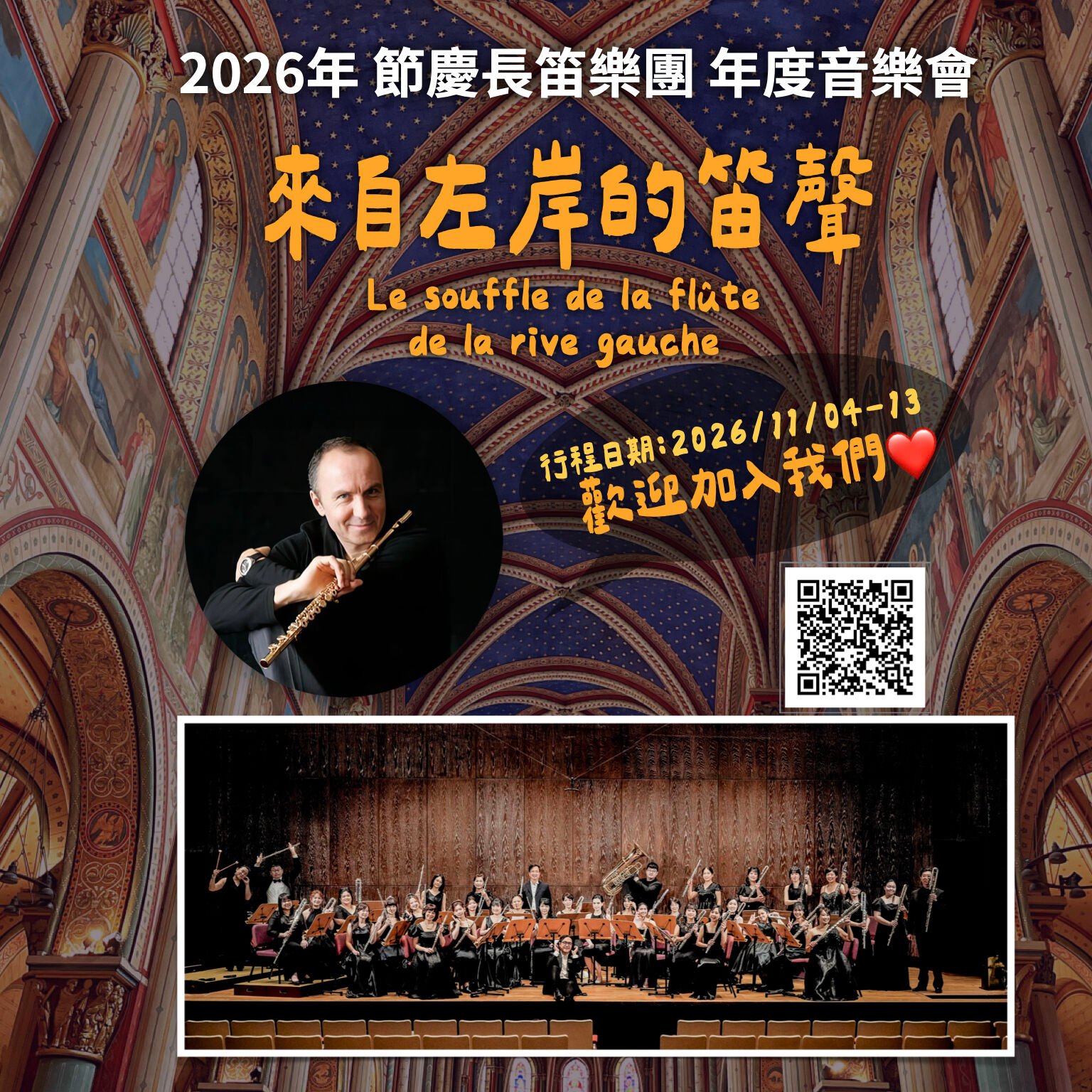 節慶長笛樂團《來自左岸的笛聲》音樂會,將於2026年在巴黎,於六世紀起最傳奇且音效絕佳的巴黎聖日耳曼德普雷教堂,邀請法國國際知名長笛大師:貝諾瓦.佛蒙傑交流與合作演出,更將讓樂團音色與質感,暈上一層濃