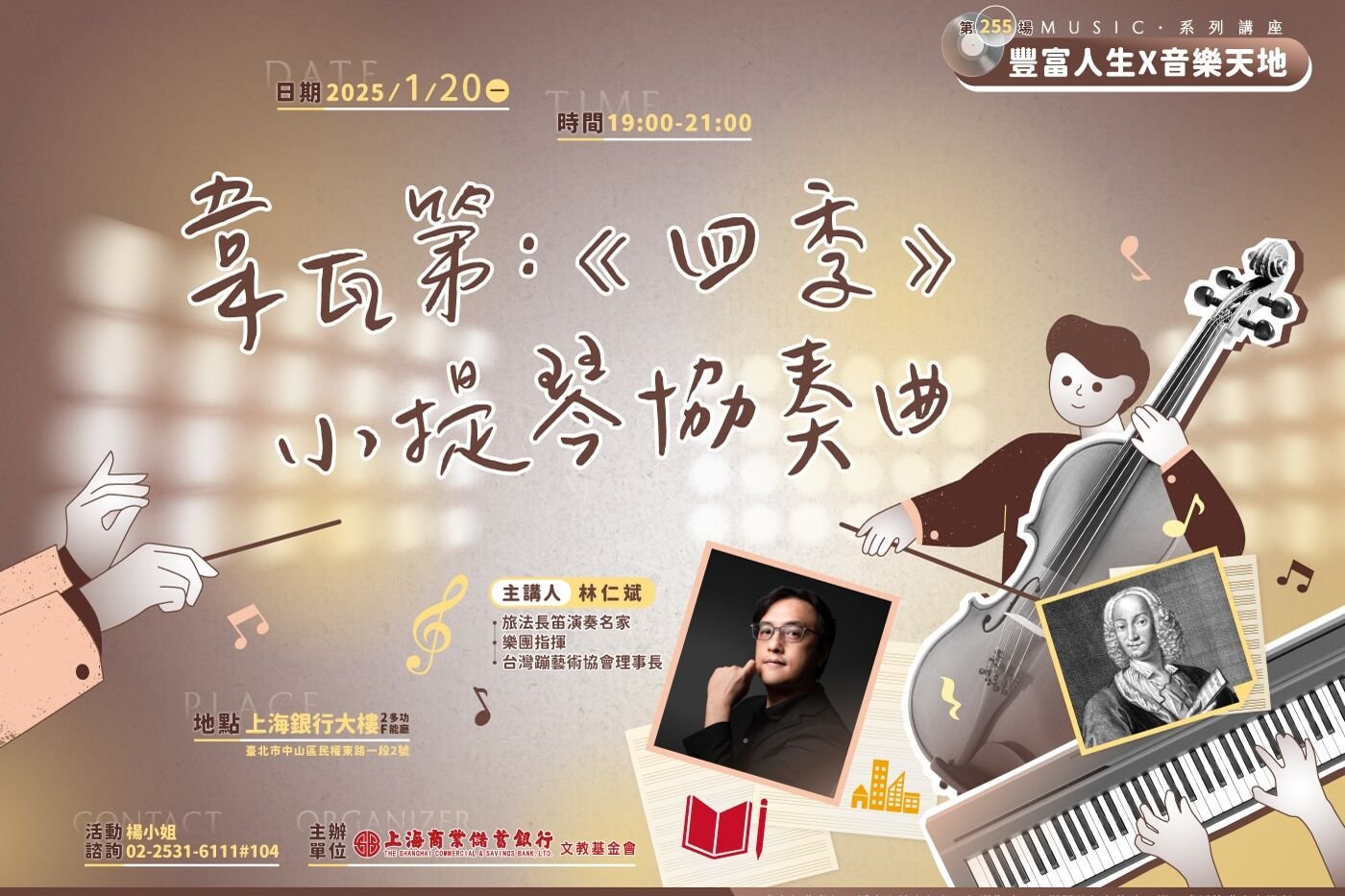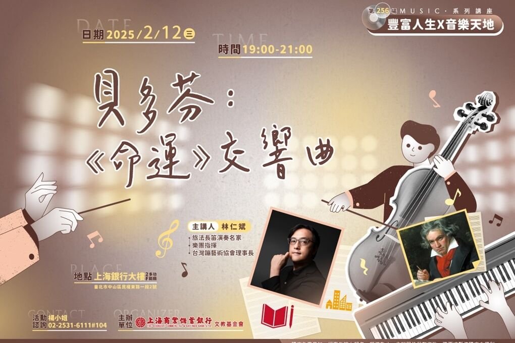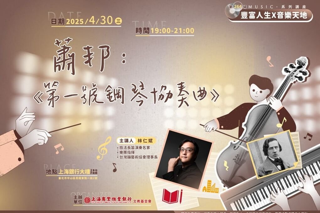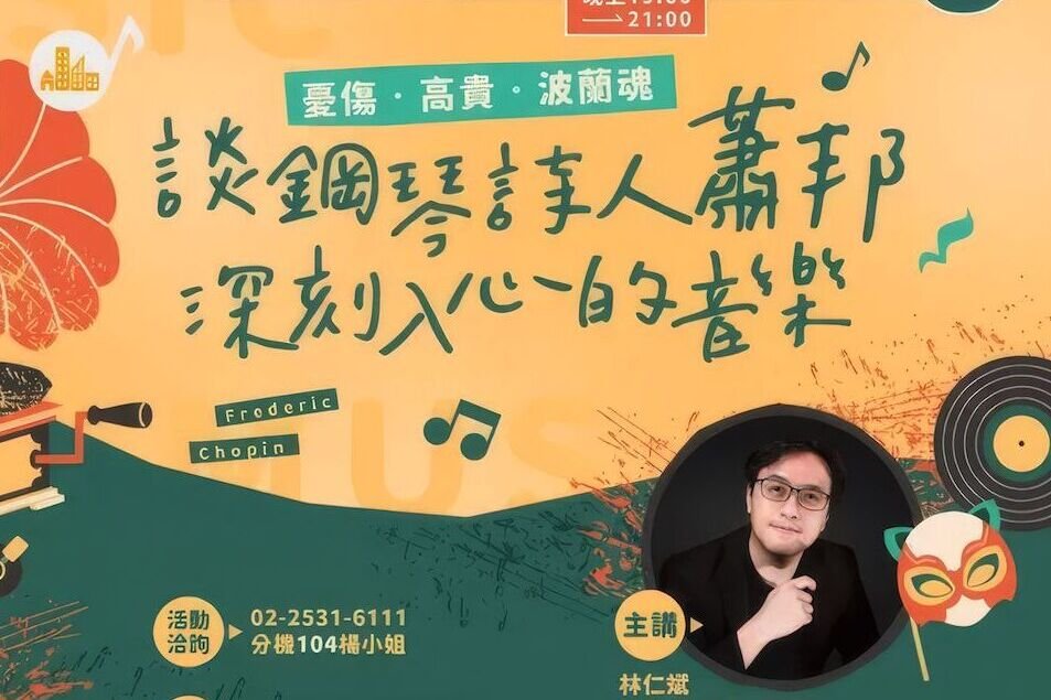 本場講座林仁斌老師將為大家介紹蕭邦的生命脈絡與創作歷程,從華沙到巴黎,從民族情感到浪漫抒情語彙,探討其音樂語言的形成背景。並介紹波蘭蕭邦鋼琴大賽自1927年創辦以來的歷史發展,涵蓋評審制度、曲目演變、演奏美學趨勢等,透析其作為國際鋼琴詮釋權威標竿的文化意義。…