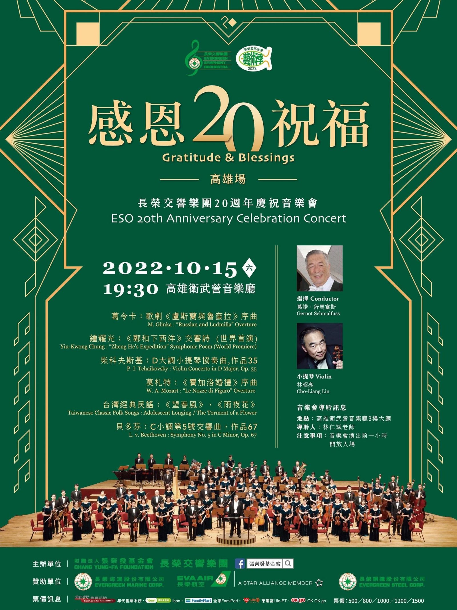 長榮交響樂團20週年慶祝音樂會《感恩與祝福》將以俄國19世紀的西方音樂先驅:葛令卡《盧斯蘭與魯蜜拉》序曲揭開序幕;鍾耀光最新邀約創作《鄭和下西洋》交響詩(世界首演)接續壯大氣勢,並由小提琴演奏家林昭亮