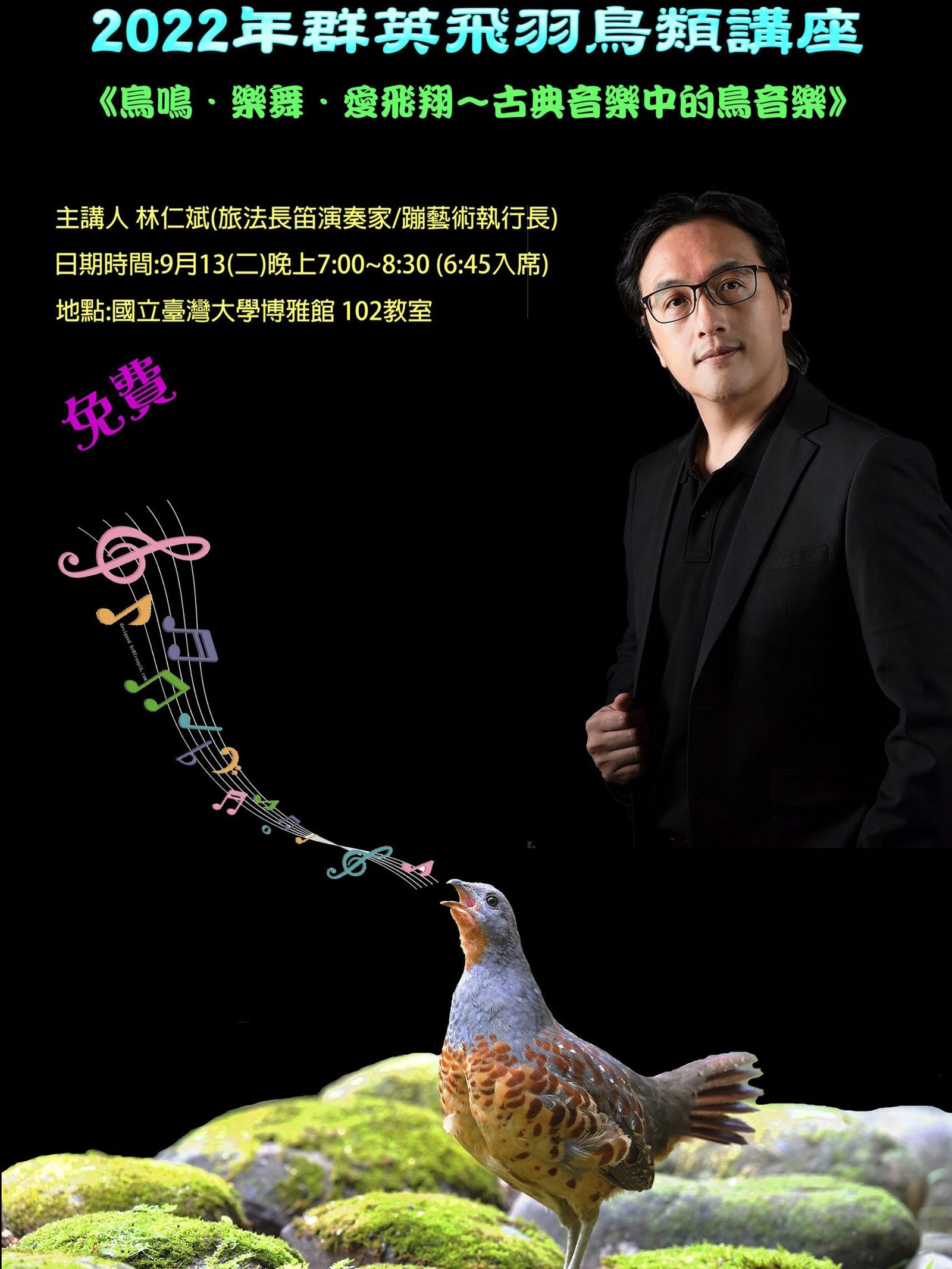 在音樂史中,鳥鳴一直是作曲家喜愛的題材,從巴洛克時期到當代音樂,甚至芭蕾舞劇裡亦見蹤跡,動聽又精彩。本場講座中,精通長笛演奏的林仁斌老師,將為您介紹古典音樂中的鳥音樂,結合群英攝影師們所拍攝之台灣30