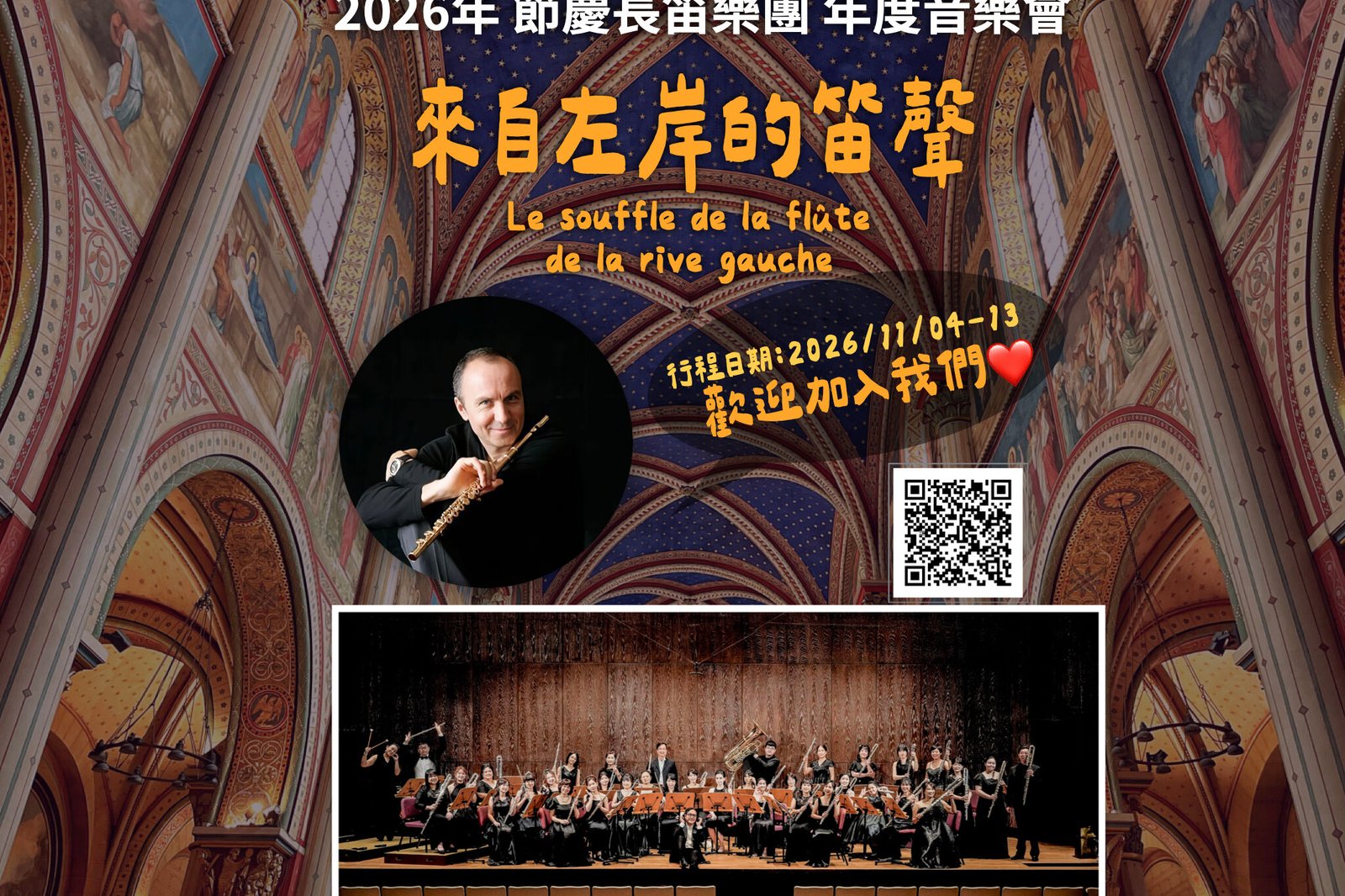 節慶長笛樂團《來自左岸的笛聲》音樂會,將於2026年在巴黎,於六世紀起最傳奇且音效絕佳的巴黎聖日耳曼德普雷教堂,邀請法國國際知名長笛大師:貝諾瓦.佛蒙傑交流與合作演出,更將讓樂團音色與質感,暈上一層濃濃法式品味,也讓所有團員們得以藉由音樂會重新學習、感受更加高貴典雅的長笛音色。歡