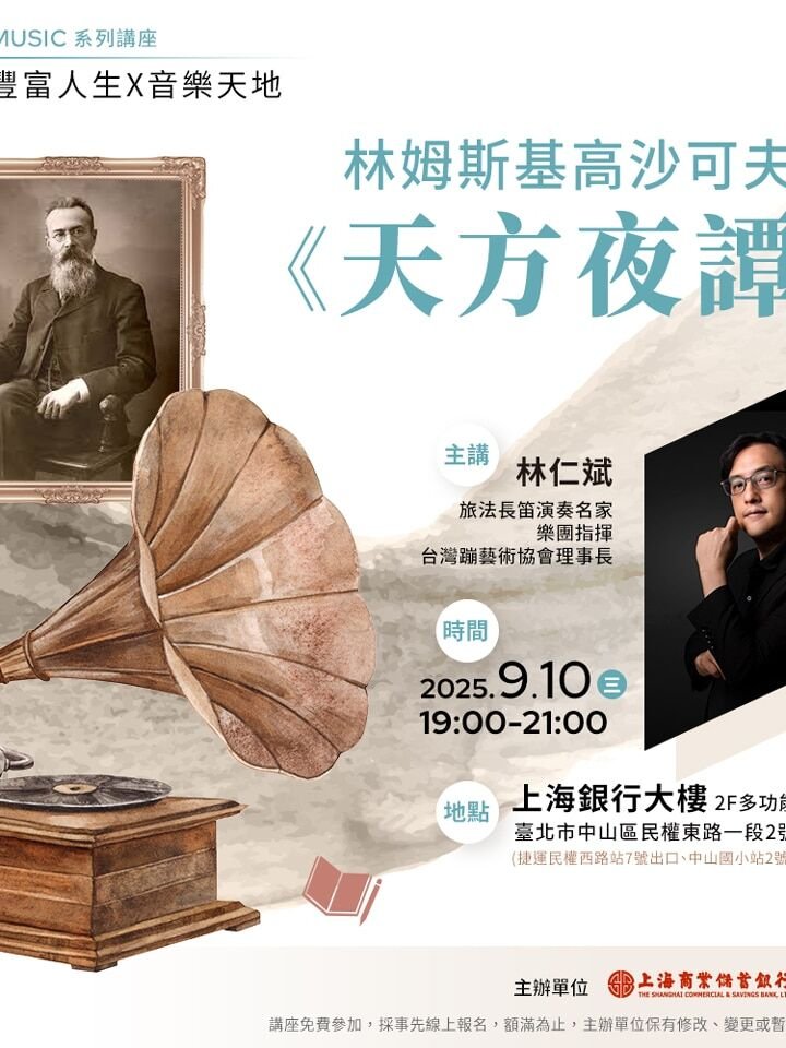 千夜萬夜的傳說,在音符中悄然展開;一段段迷人的故事,不在書頁裡,而在旋律中閃閃發光。在這場講座中,我們邀請林仁斌老師,帶您走入俄國作曲大師林姆斯基-高沙可夫筆下的傳奇鉅作——《天方夜譚》。這部作品靈感